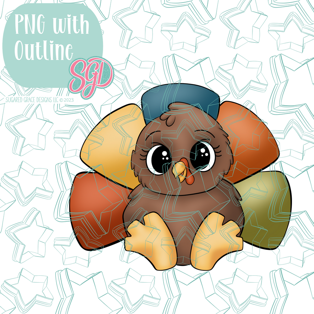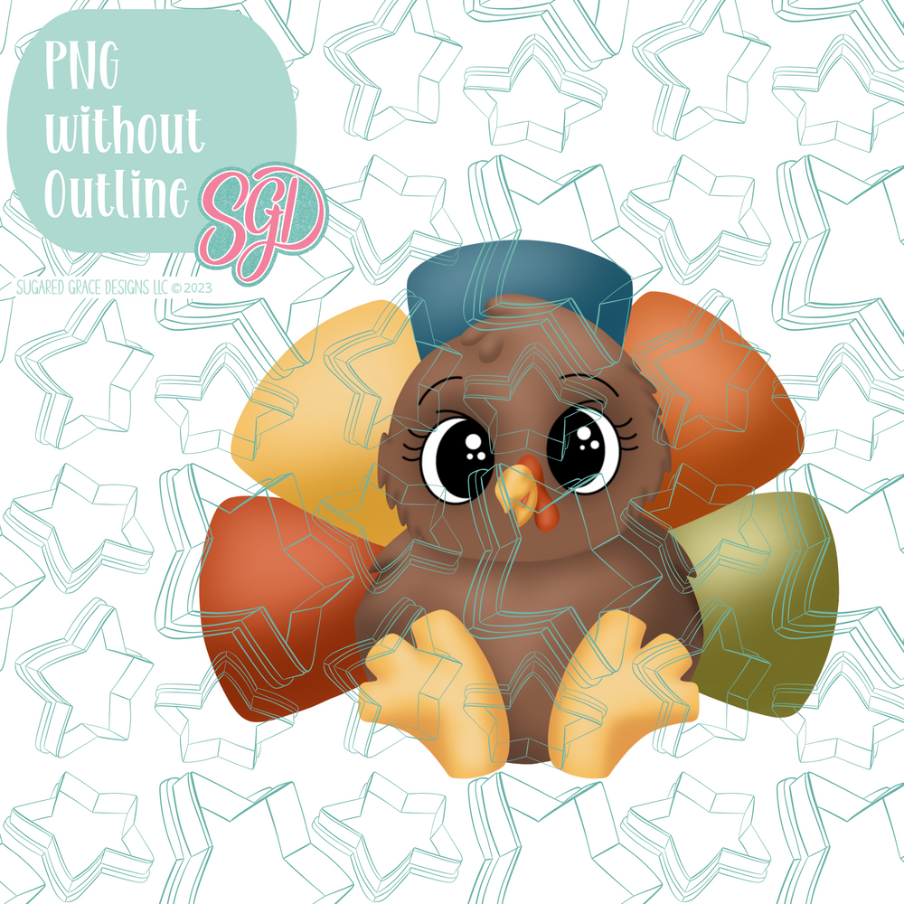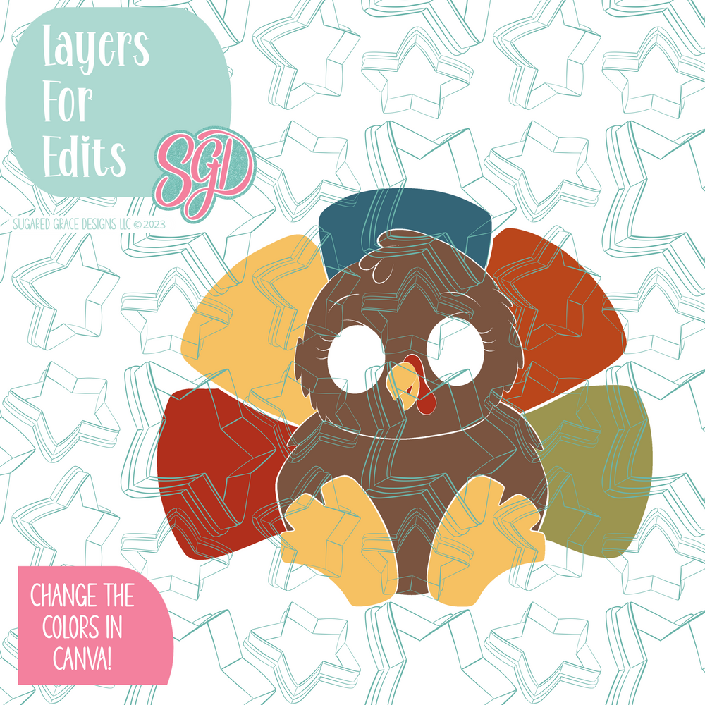 Meet the chubbiest turkey on the block. Cute, pumpkin and made for easy decorating! This friendly turkey is perfect for Thanksgiving, friendsgiving or any cozy fall gathering. Decorate with a projector or print with an edible ink printer. It’s chunky shape makes flooding and details fast, (hello, batch decorating!) and it pairs happily with a pie platters or plaque toppers for show stopping dessert tables!