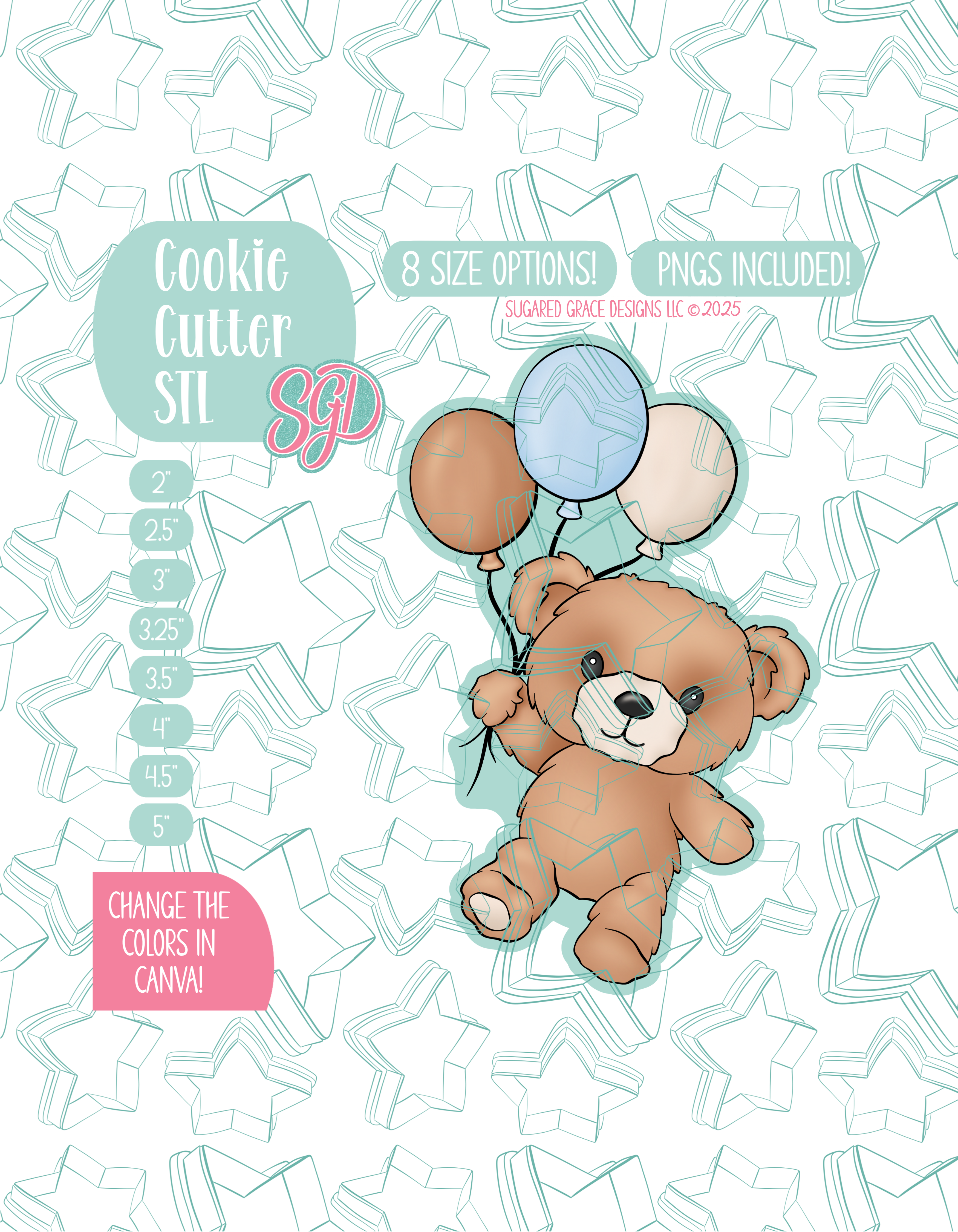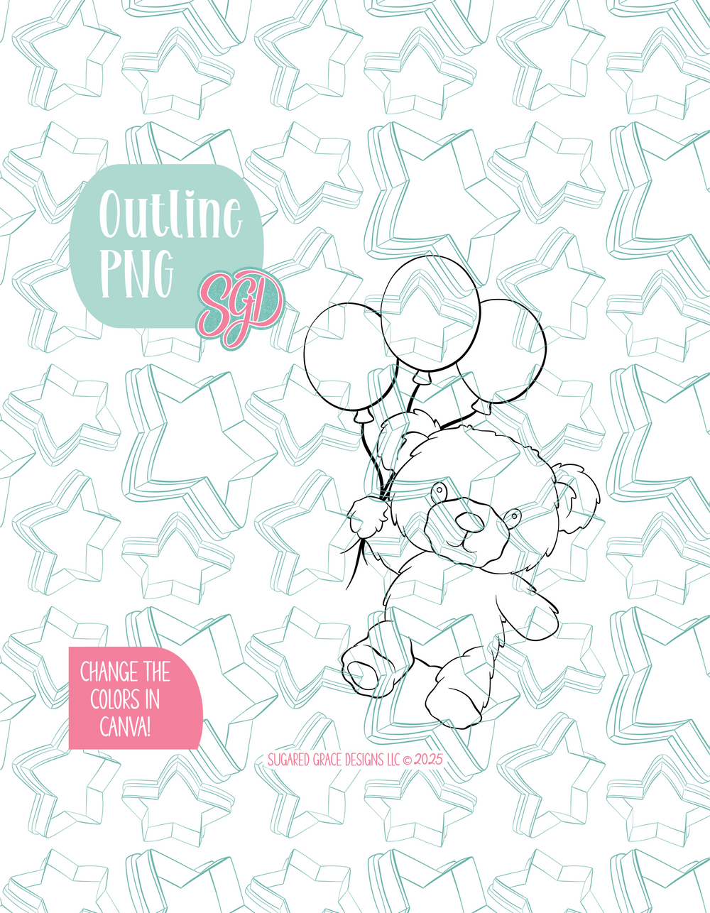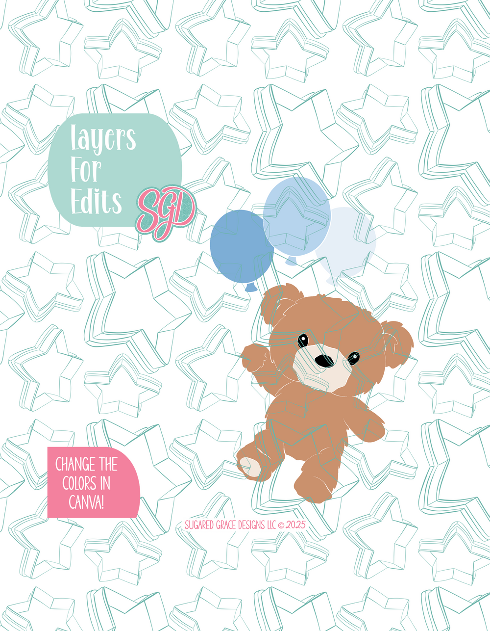 This sweet little teddy bear floating away with balloons is ready to bring the cutest charm to your next celebration! Originally designed for the trendy “We Can Bearly Wait” theme, this design works perfectly for baby showers, gender reveal parties, nursery decorations, or any bear-themed celebration. With customizable balloon colors, you can match your even palette effortlessly! Whether its soft neutrals, pastel blues, or bright pops of color, simply drop the layers into Canva and make the changes. Ideal for decorating cookies, party favors, or themed desserts, this teddy bear design adds a playful and heartwarming touch that your guests will love. From floating balloon centerpieces to cozy wall art vibes, this bear is ready to make your bakes beary special!