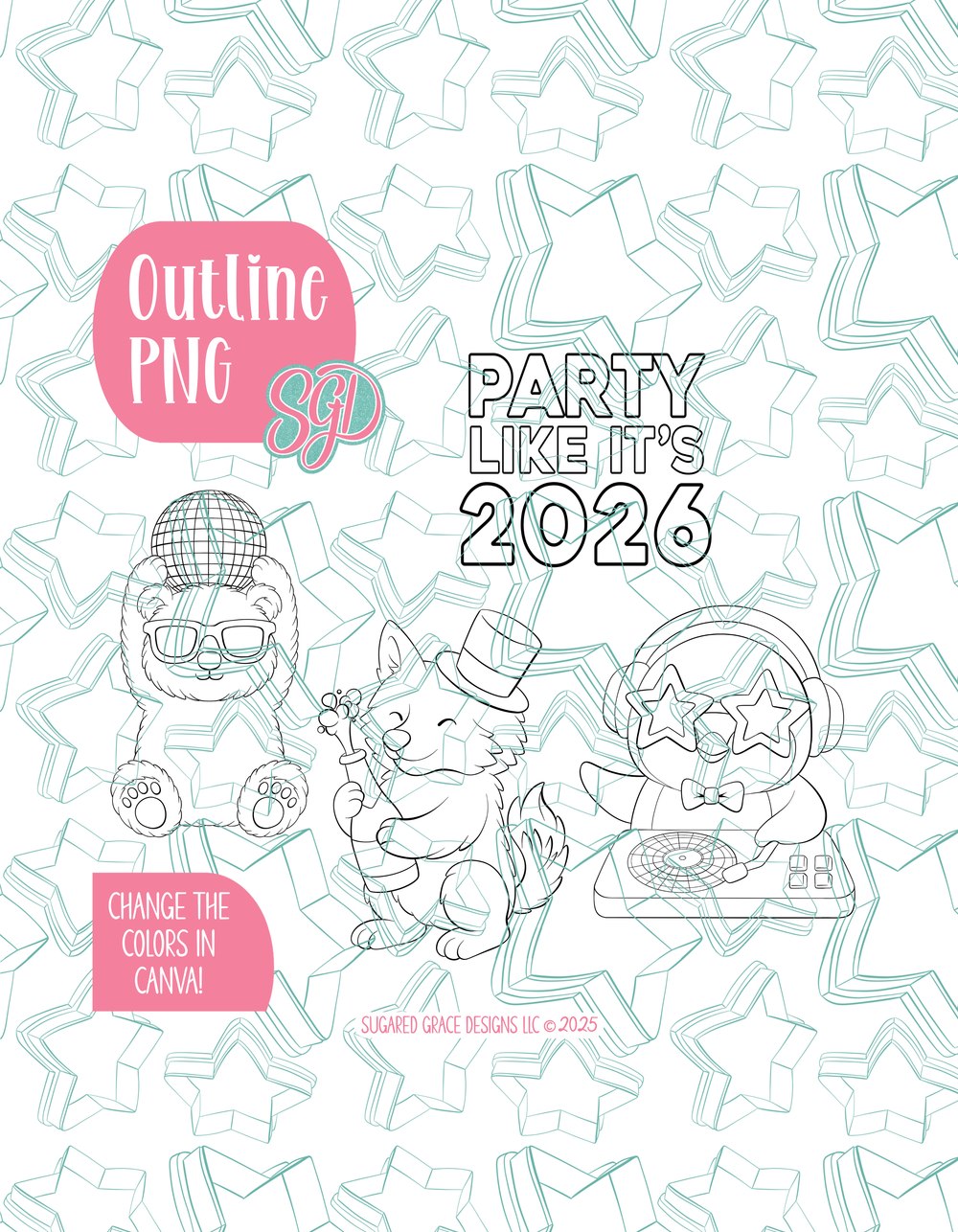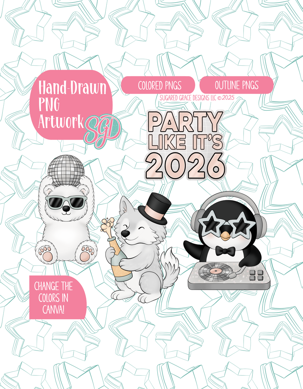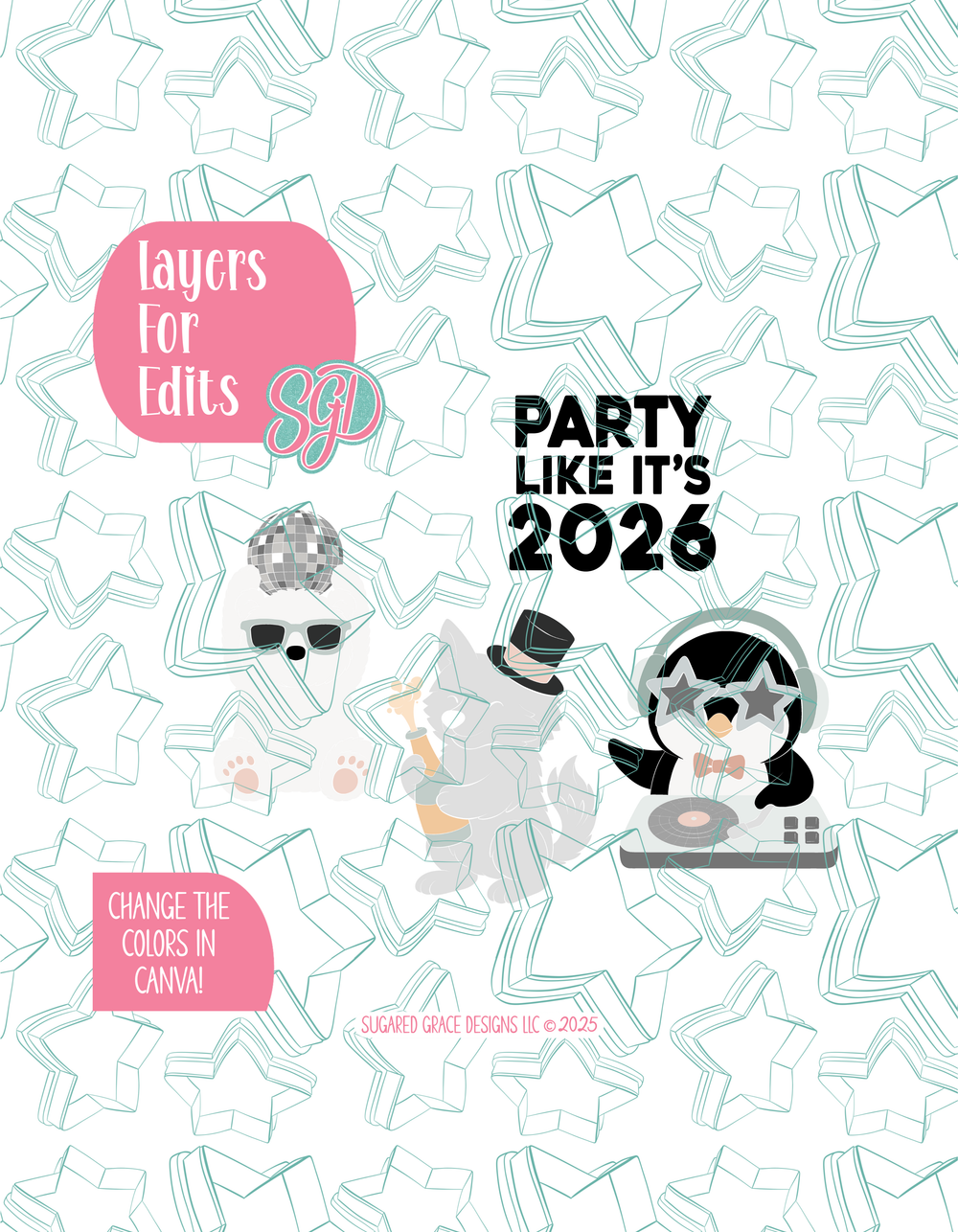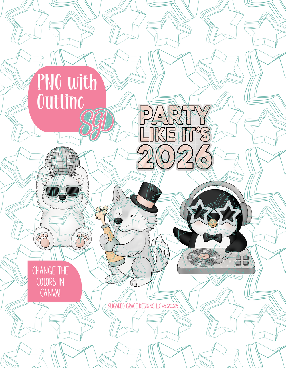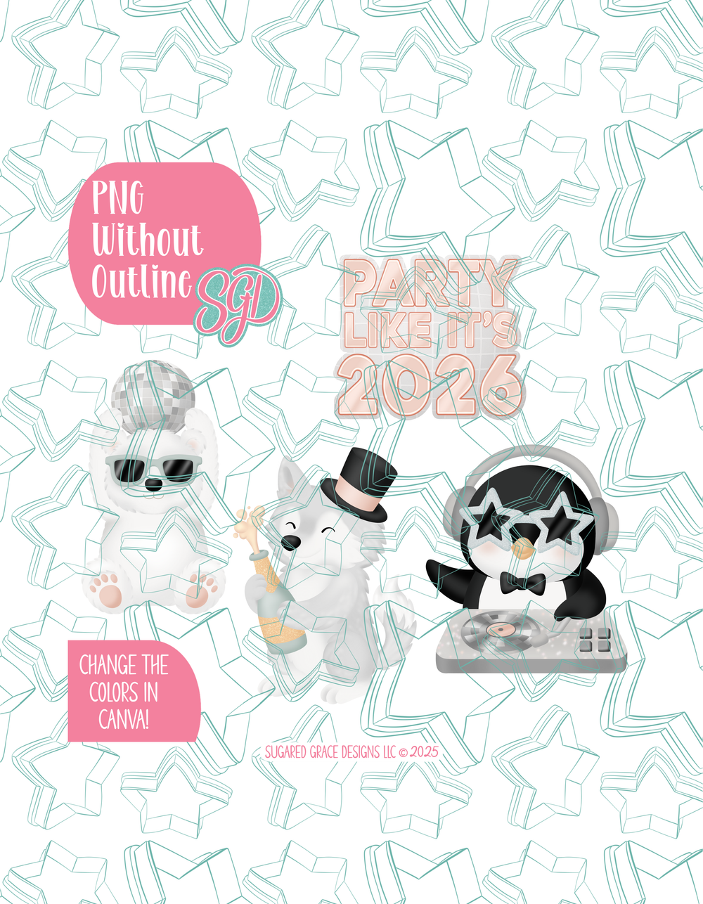 Ring in the celebration with this arctic party animal New Year Set, featuring a festive mix of winter characters ready to dance their way into 2026. From disco glowing polar bear and champagne toasting arctic wolf to the star glasses penguin DJ and the “Party like it's 2026” Plaque; each design brings its own dose of sparkle, charm and countdown excitement. Perfect for holiday markets, New Years party themes, arctic animal collections, or any winter wonderland cookie lineup, this set delivers a joyful mix of music, bubbly, and midnight magic that customers can’t help but adore.