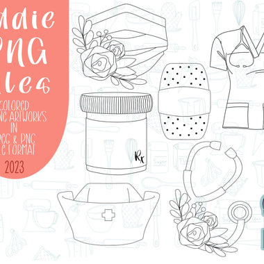 Nurse appreciation png graphic bundle set for Eddie edible printer, floral stethoscope, doctor scrubs and cap, Pill bottle royal icing image