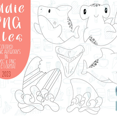 Shark week png graphic bundle set for Eddie edible printer, hammerhead shark royal icing image, ocean beach birthday party, surf boards