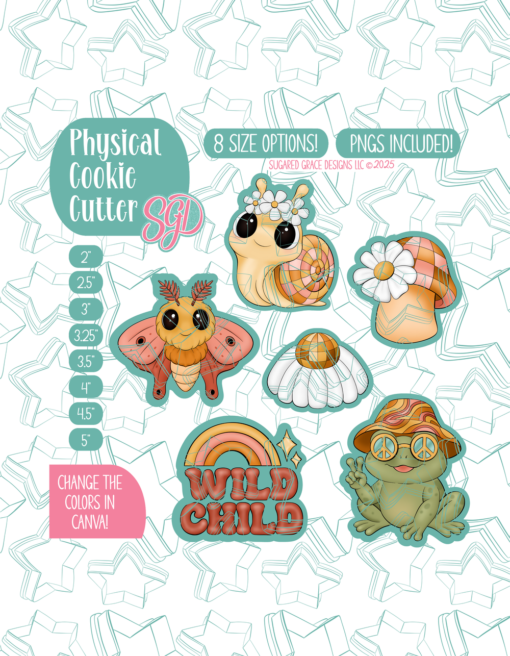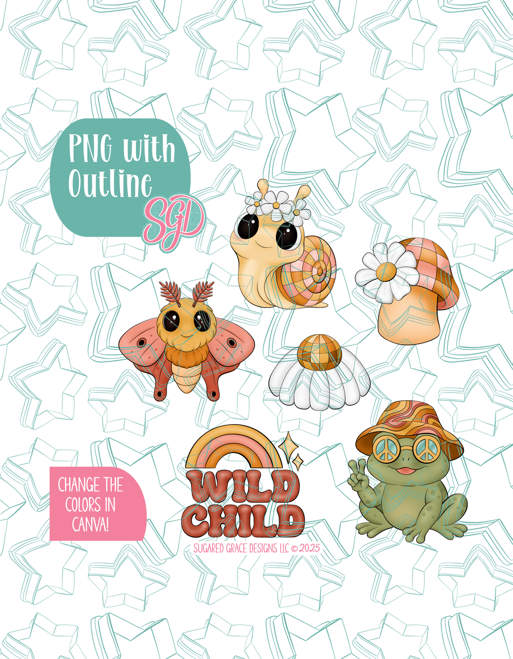 ⭐️6 Designs: Disco Daisy - SGD251105, Disco Mushroom- SGD251106, Groovy Frog - SGD251107, Hippie Snail - SGD251108, Lunar Moth - SGD251109, Wild Child Plaque - SGD251110