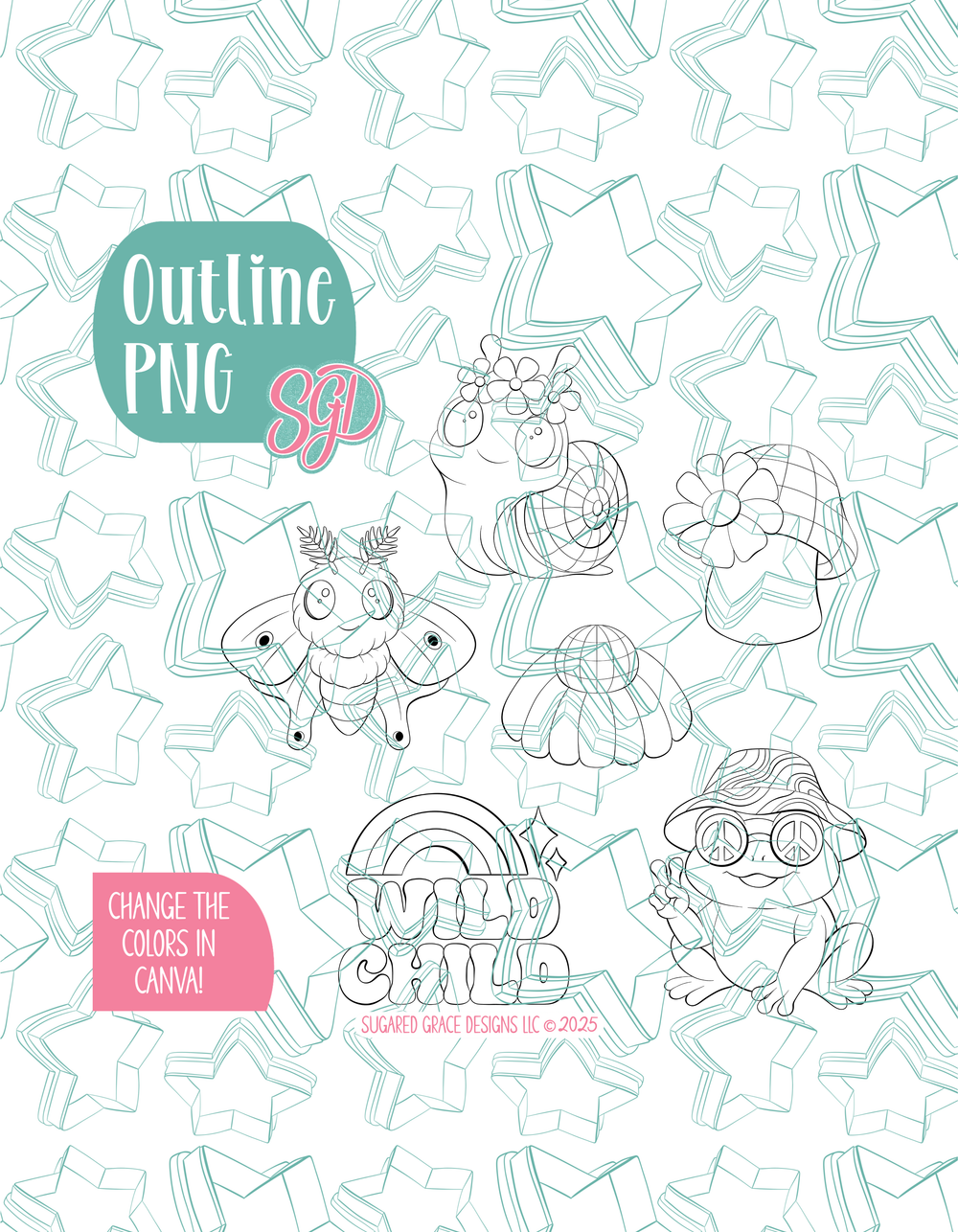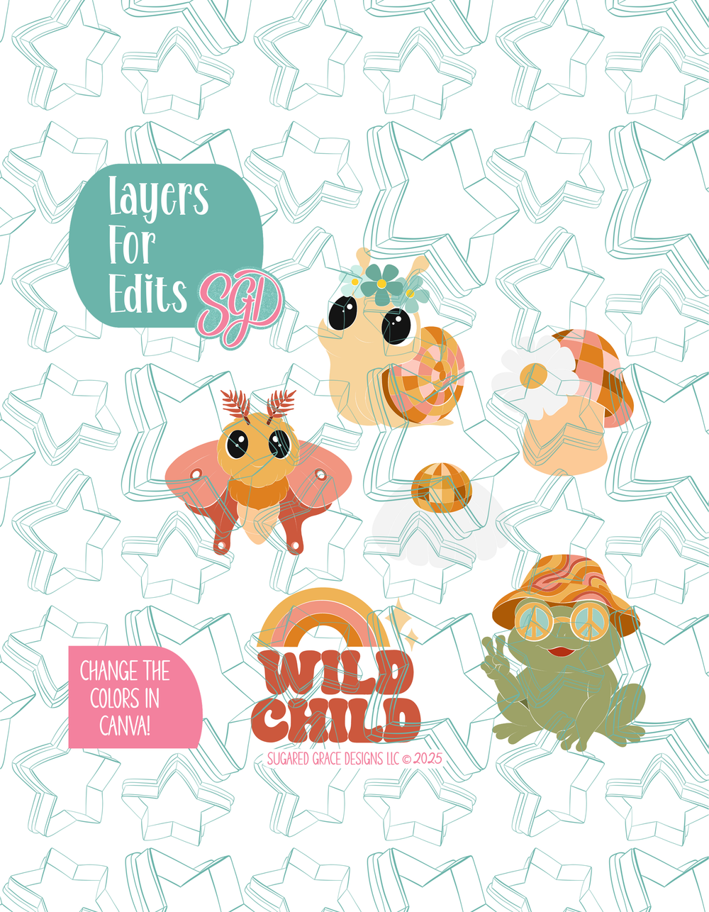 This whimsical disco wild child set is ready to bring all the groovy charm, retro sparkle, and playful energy to your next celebration! It fits beautifully into boho birthdays, groovy rainbow themes,  wild one parties, woodland inspired sets, and even the ever popular “One Groovy Baby” baby shower. You’ll love how simple these designs are to decorate! Just cut, bake, flood, and print using the included PNGs for crisp results, quick turnaround times, and beautifully consistent cookies; even in high volume orders. And because every included PNG is fully editable in Canva, you can easily adjust the colors to match any theme or custom palette your customers request! It’s an all star collection that will leave your customers coming back again and again!