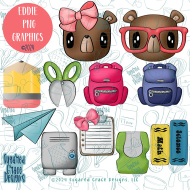 Hand Drawn Back To School PNG Image Set for Edible Ink Printers Including Eddie and line art for High Quality PYO Cookie Kits