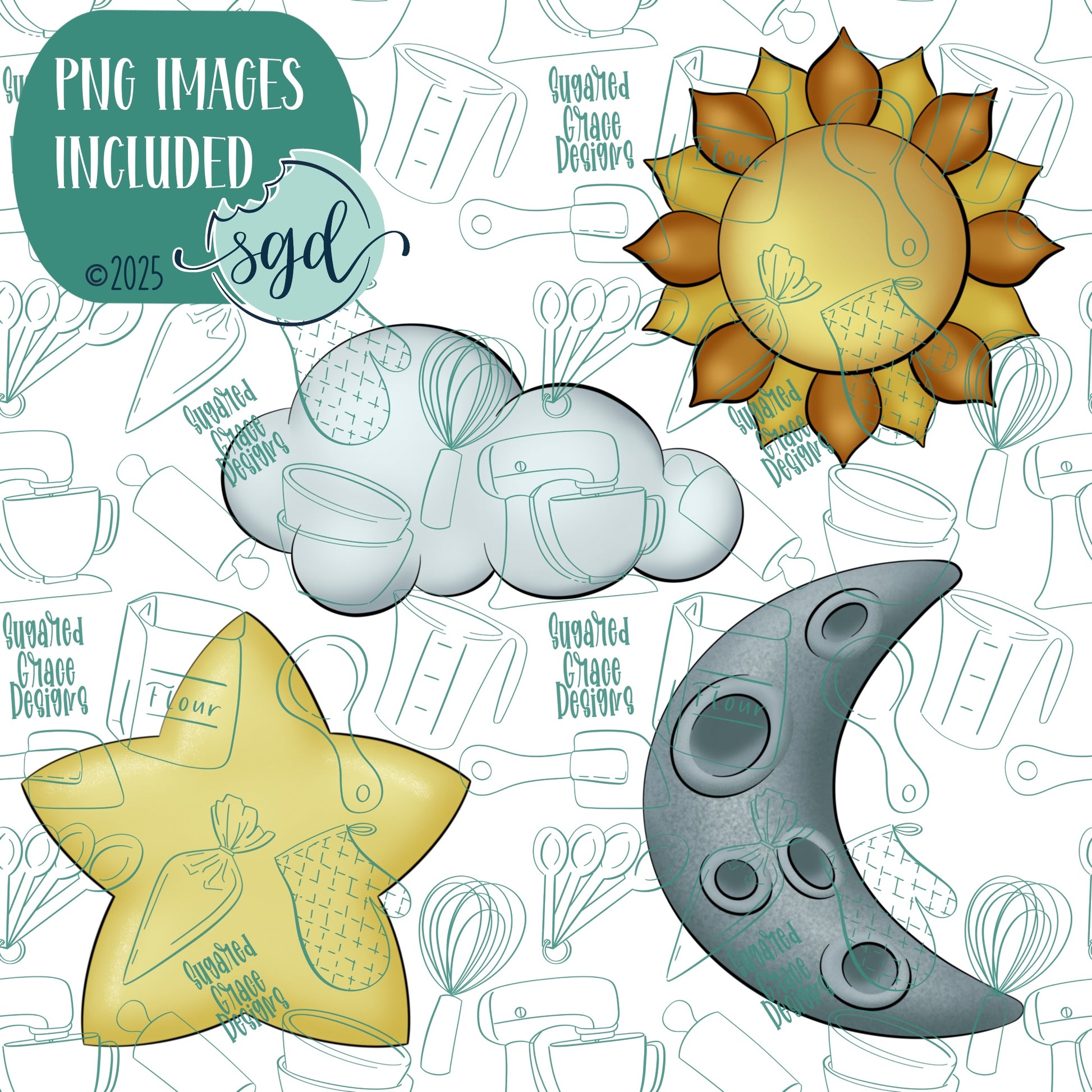 Celestial Sun Moon and Star Cookie Cutter Set of 4 with PNG Images to Match - Hand Drawn Graphics for Edible Ink Printers