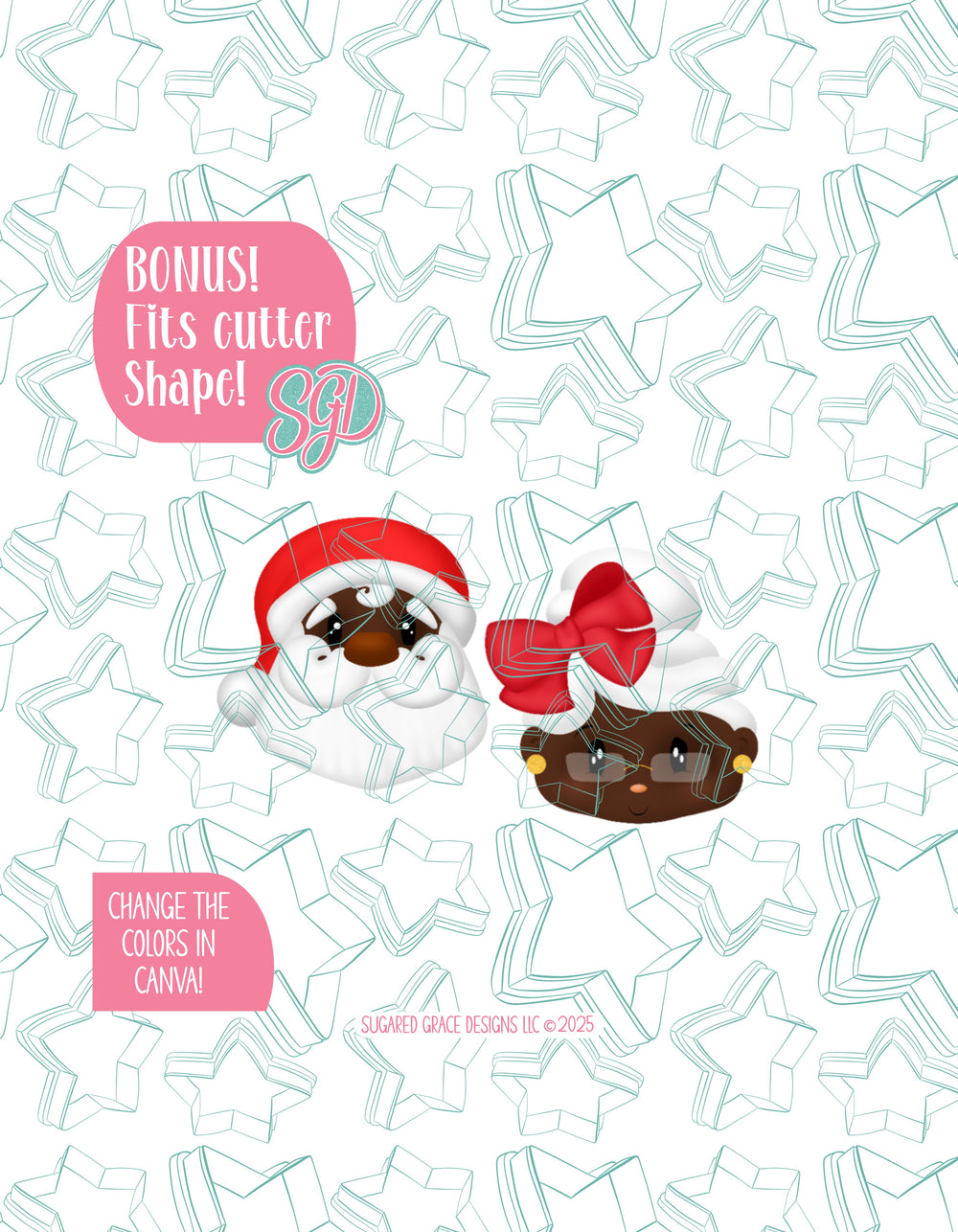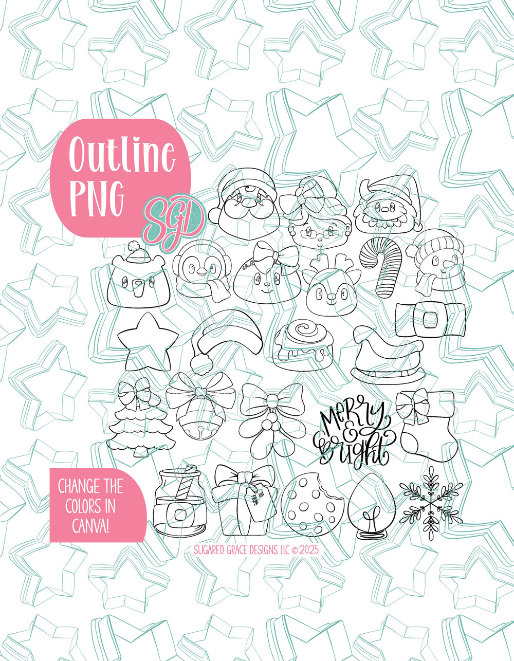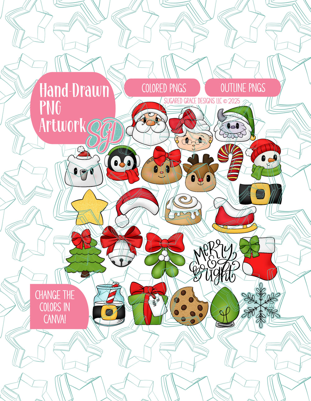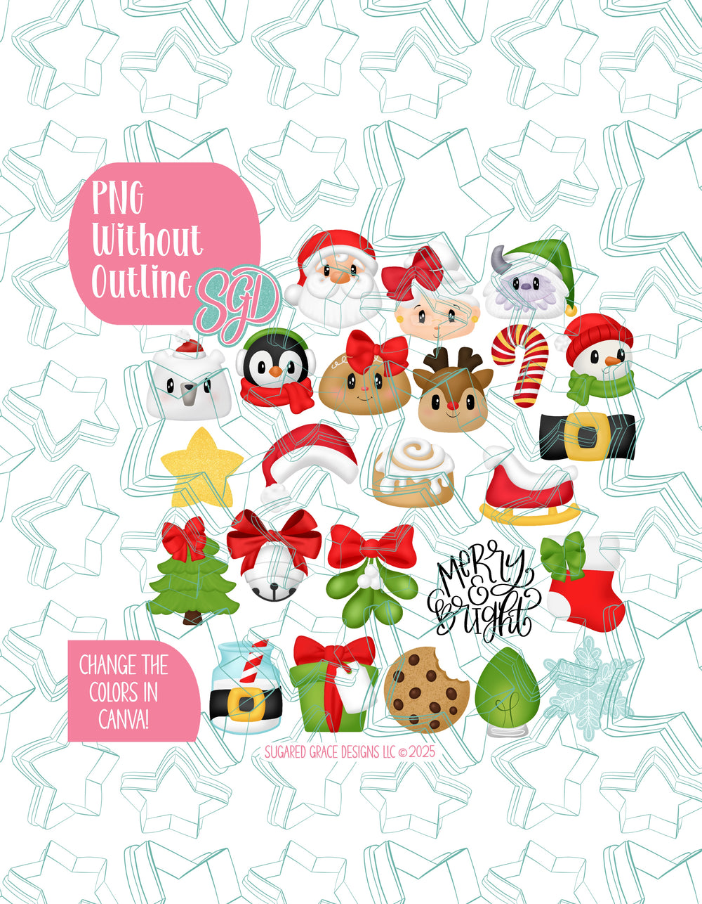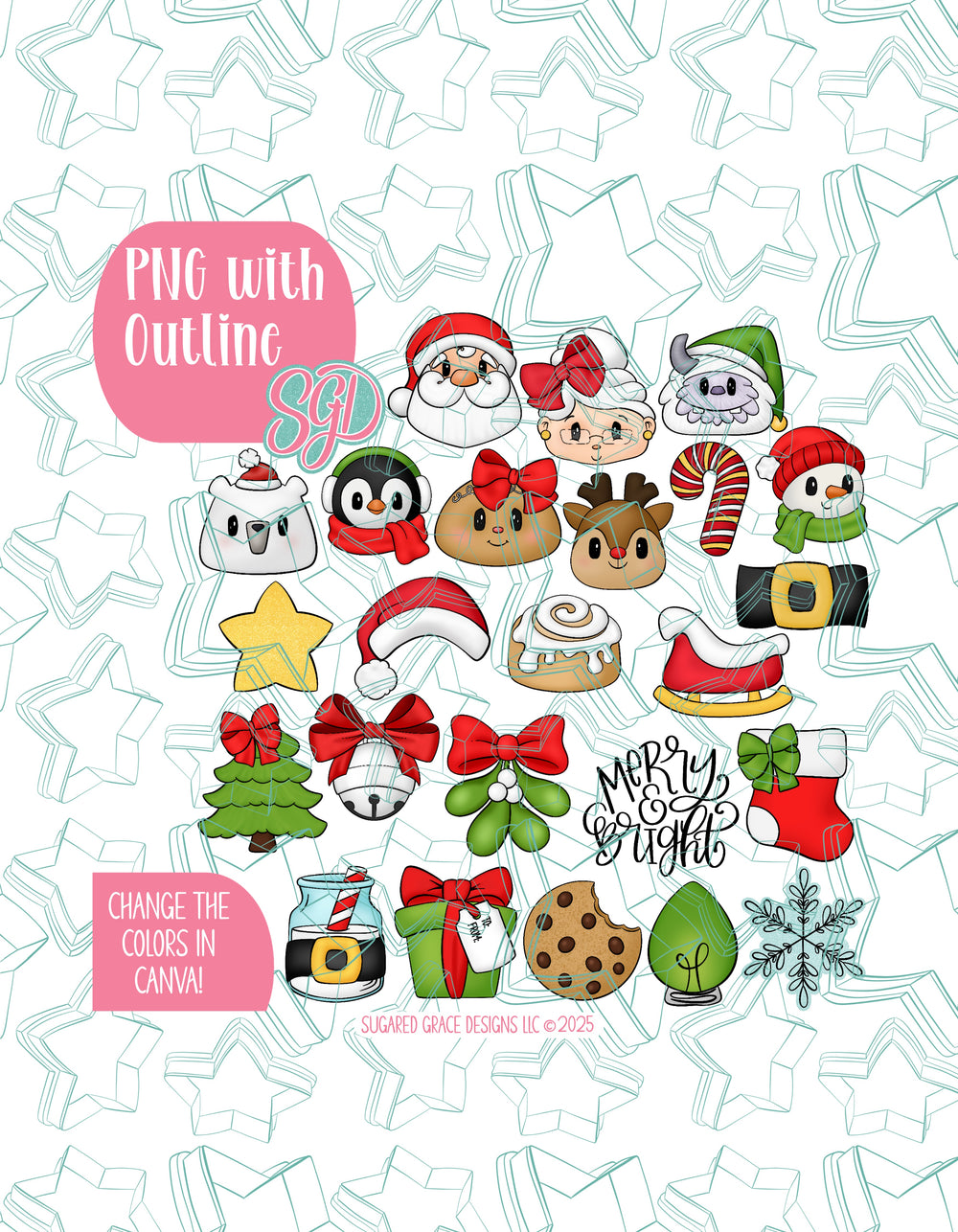 āļø24 Designs: Santa, Mrs. Claus, Yeti, Polar Bear, Penguin, Mrs. Gingerbread, Reindeer, Candy Cade, Snowman, Star, Santa Hat, Cinnamon Roll, Belt, Sleigh, Christmas Tree, Silver Bell, Mistletoe, Merry & Bright, Stocking, Santas Milk, Christmas Gift, Cookie, Christmas Bulb, and Snowflake
