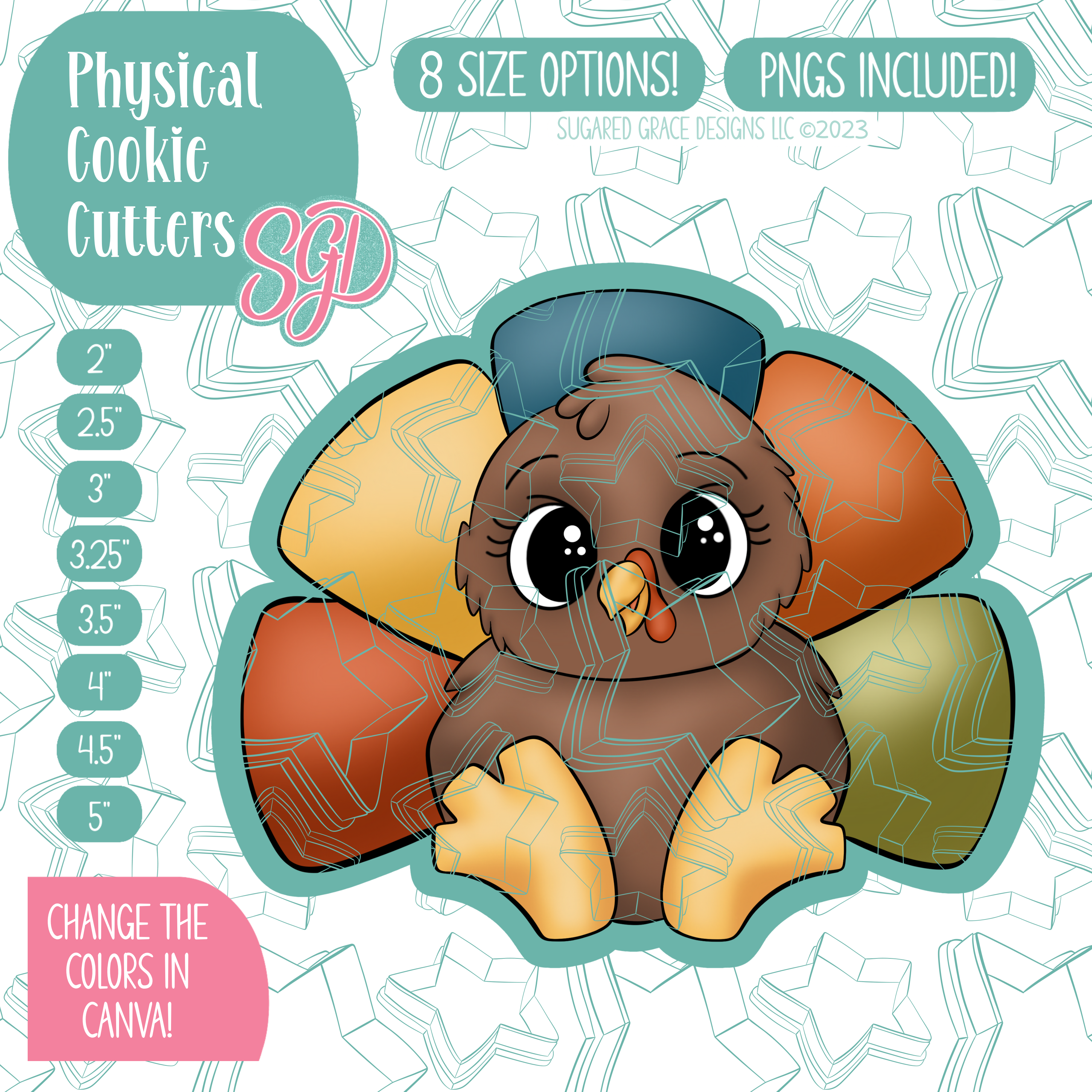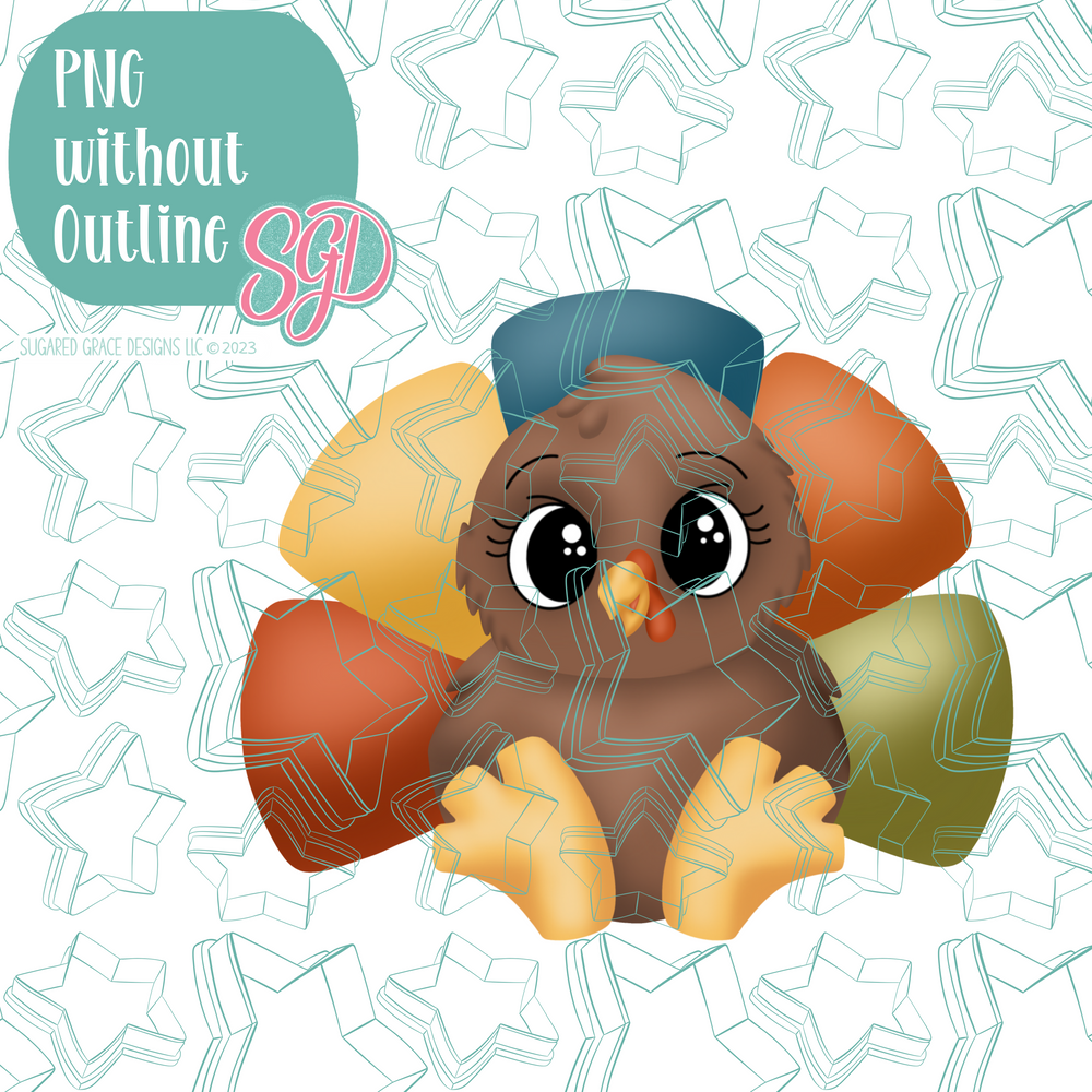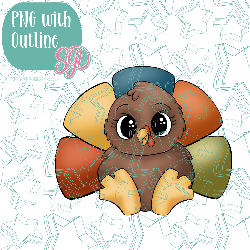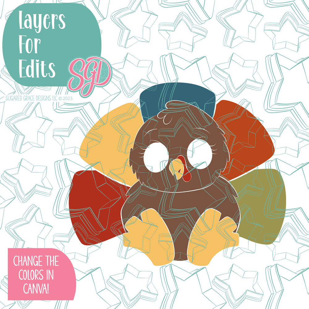 Meet the chubbiest turkey on the block. Cute, pumpkin and made for easy decorating! This friendly turkey is perfect for Thanksgiving, friendsgiving or any cozy fall gathering. Decorate with a projector or print with an edible ink printer. It’s chunky shape makes flooding and details fast, (hello, batch decorating!) and it pairs happily with a pie platters or plaque toppers for show stopping dessert tables!