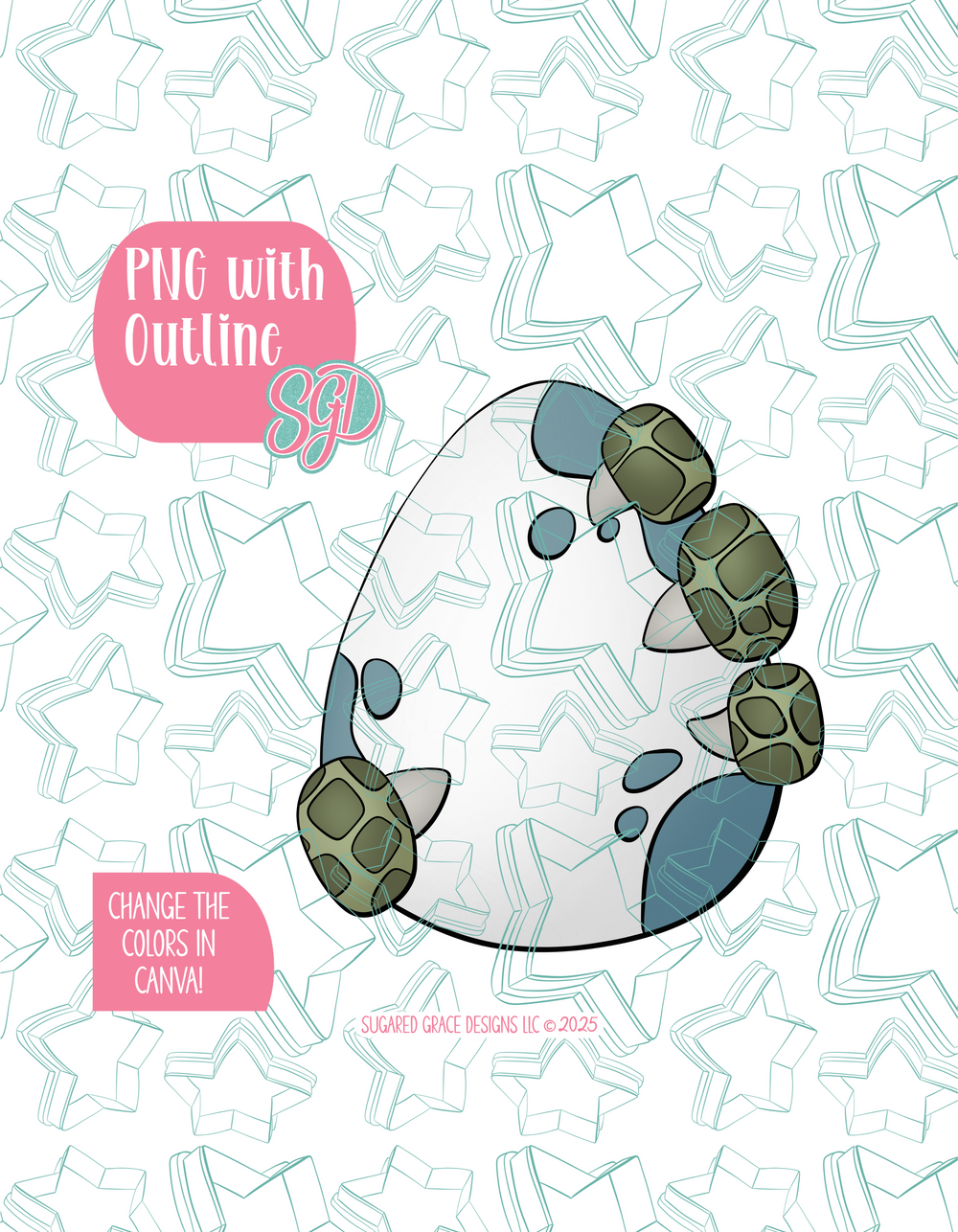 Hatch a dino-mite celebration! This dinosaur egg plaque with its chunky dino claws is designed with a  roomy center so you can add any birthday number, name or short phrase. Perfect for Two Wild, Three Rex, or Dino Four themes, this versatile piece works for first birthdays through big kid celebrations. Use the PNGs with an edible ink printer or projector for crisp outlines or drop the layers in canva to swap the colors and personalize in minutes. Scale it for minis or statement cookies, make place settings with the age front and center, or create a matching dessert table sign to complete our prehistoric spread.