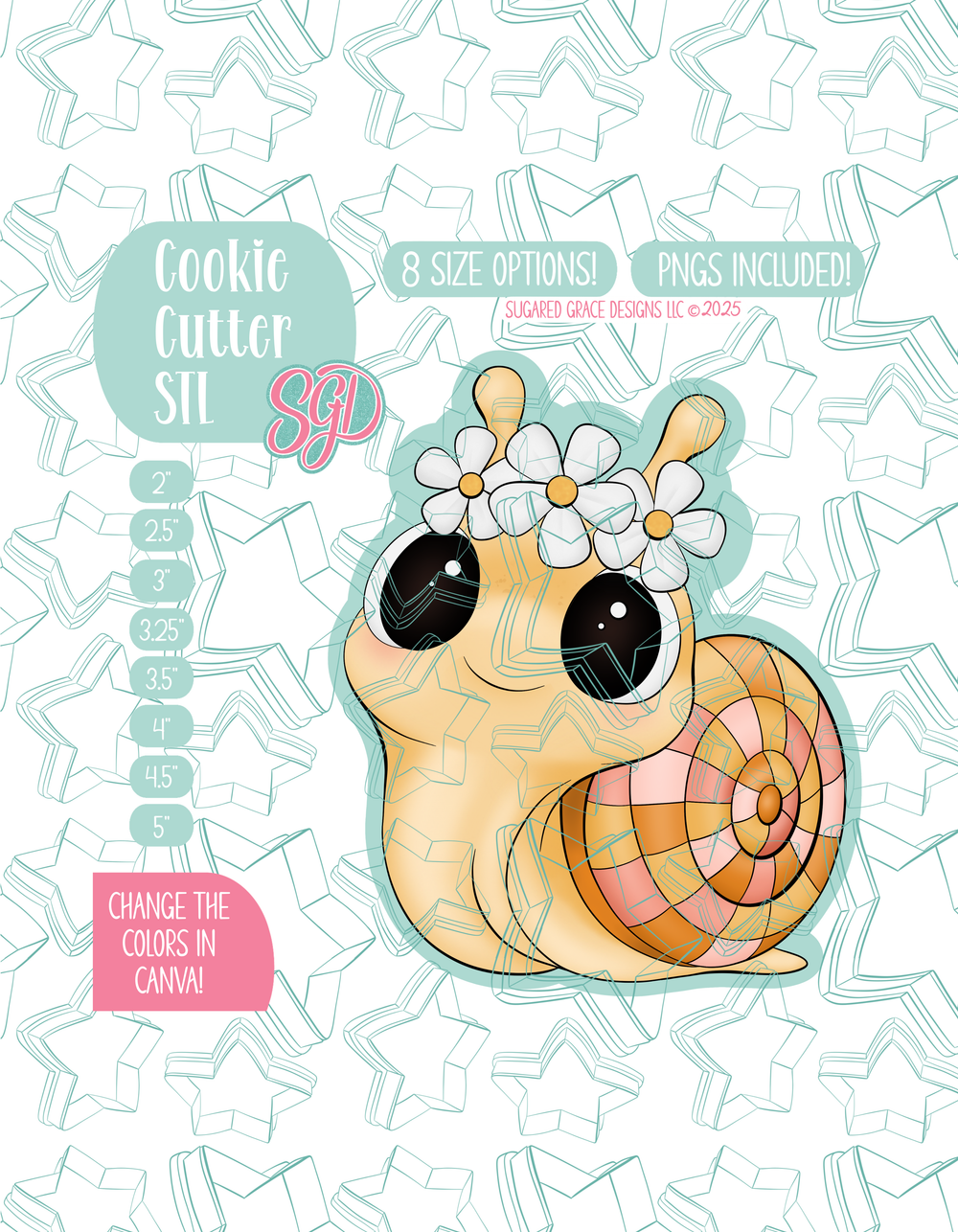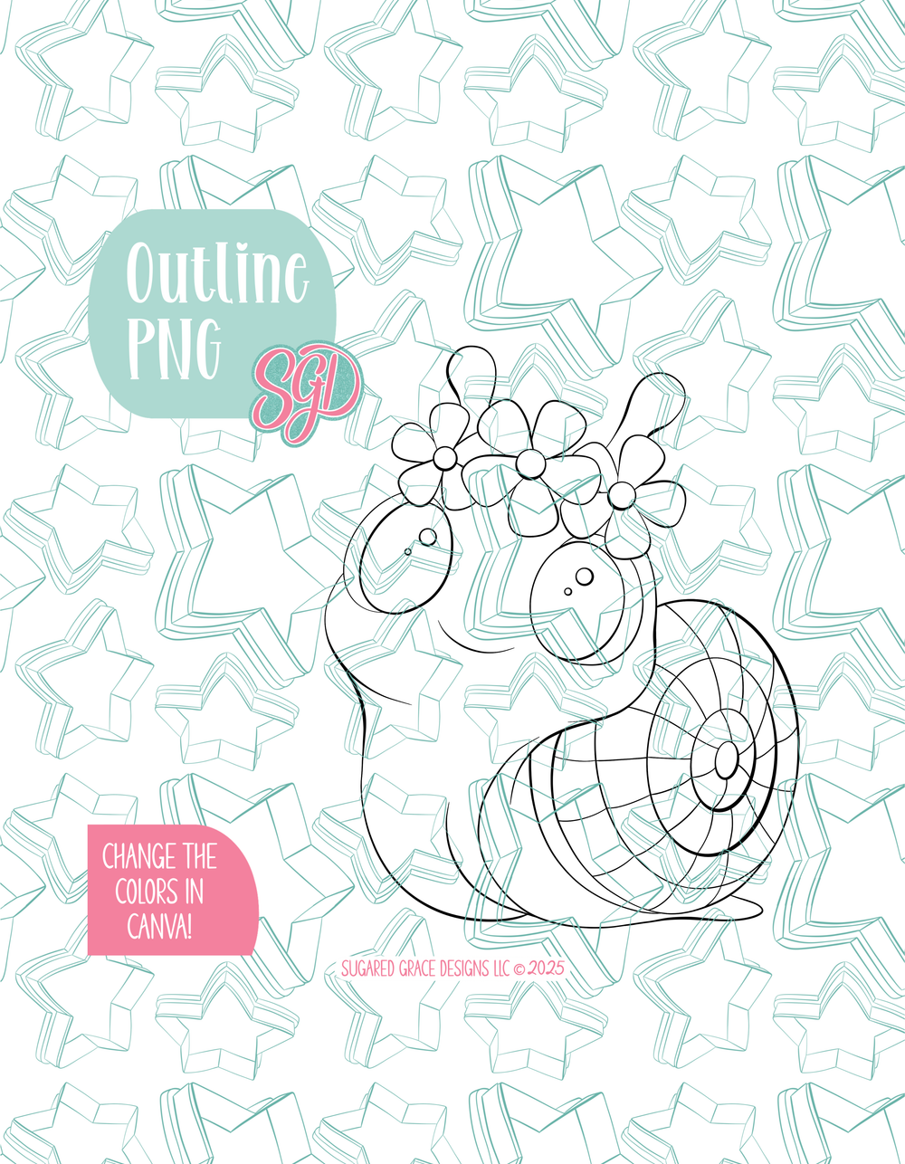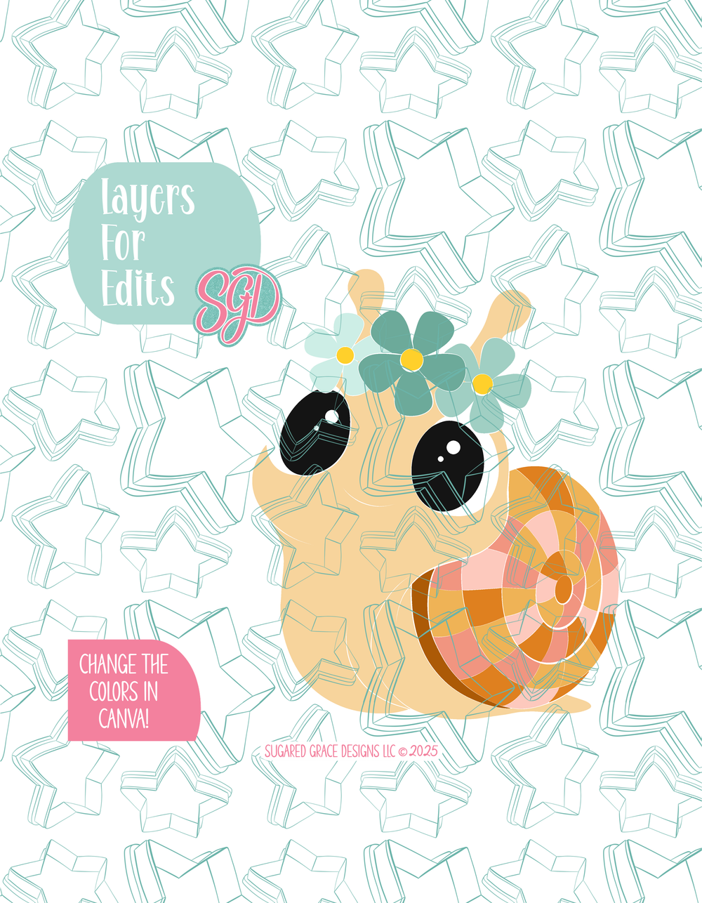 This free spirited little hippie snail is ready to glide into your next celebration with all the groovy charm your party table deserves! She fits beautifully into woodland birthdays, boho themes, wild one parties, and even the ever popular “One Groovy Baby” baby shower. You’ll love how simple this design is to decorate! Just cut, bake, flood, and print using the included PNG for crisp results, quick turnaround times, and beautifully consistent cookies, even in high volume orders. And because the included PNG is fully editable in Canva, you can easily adjust the colors to match any theme or custom palette your customers request!