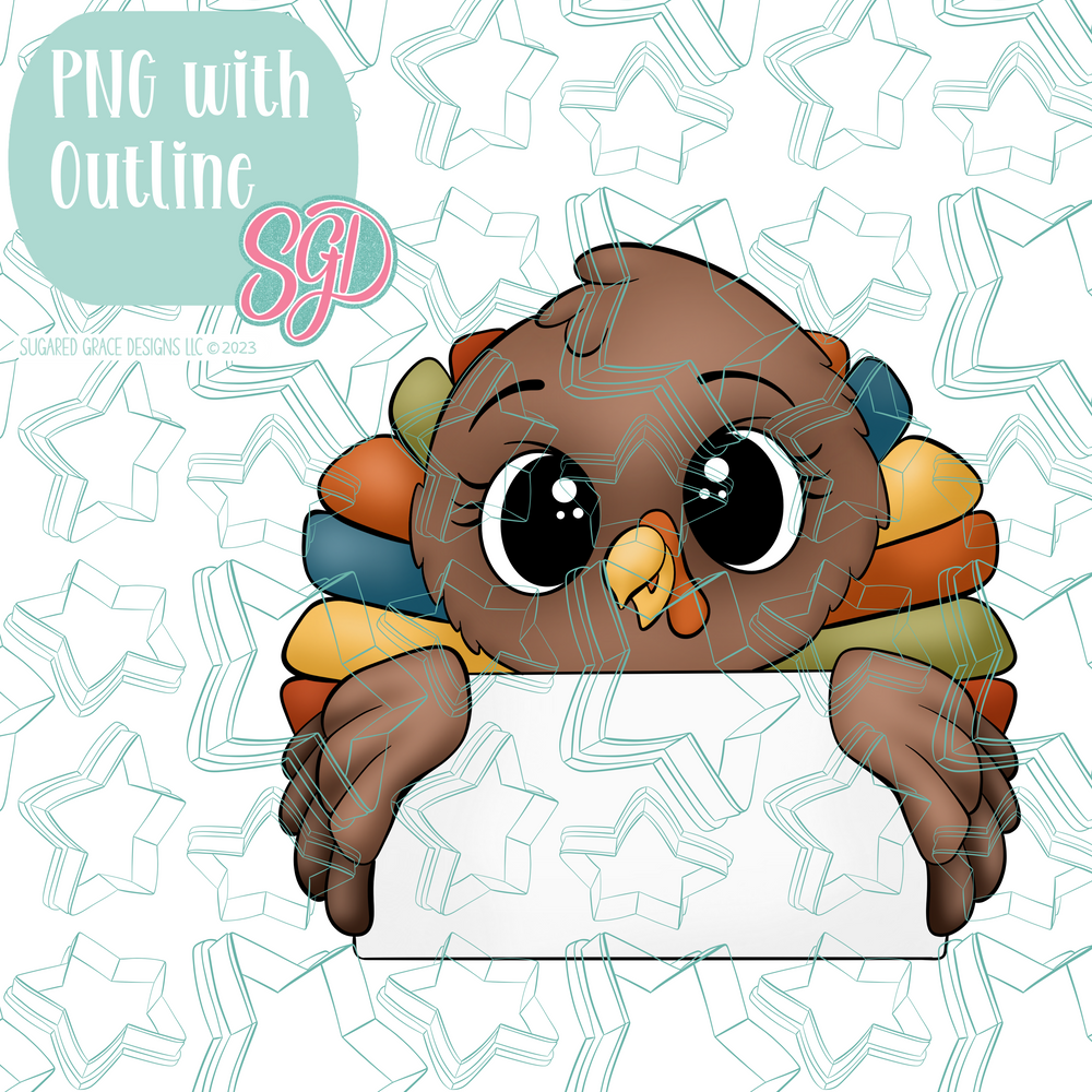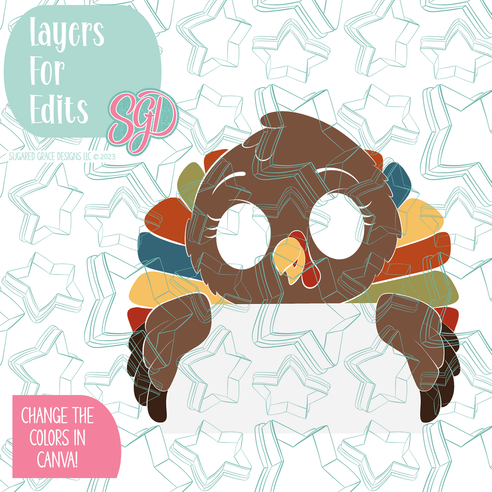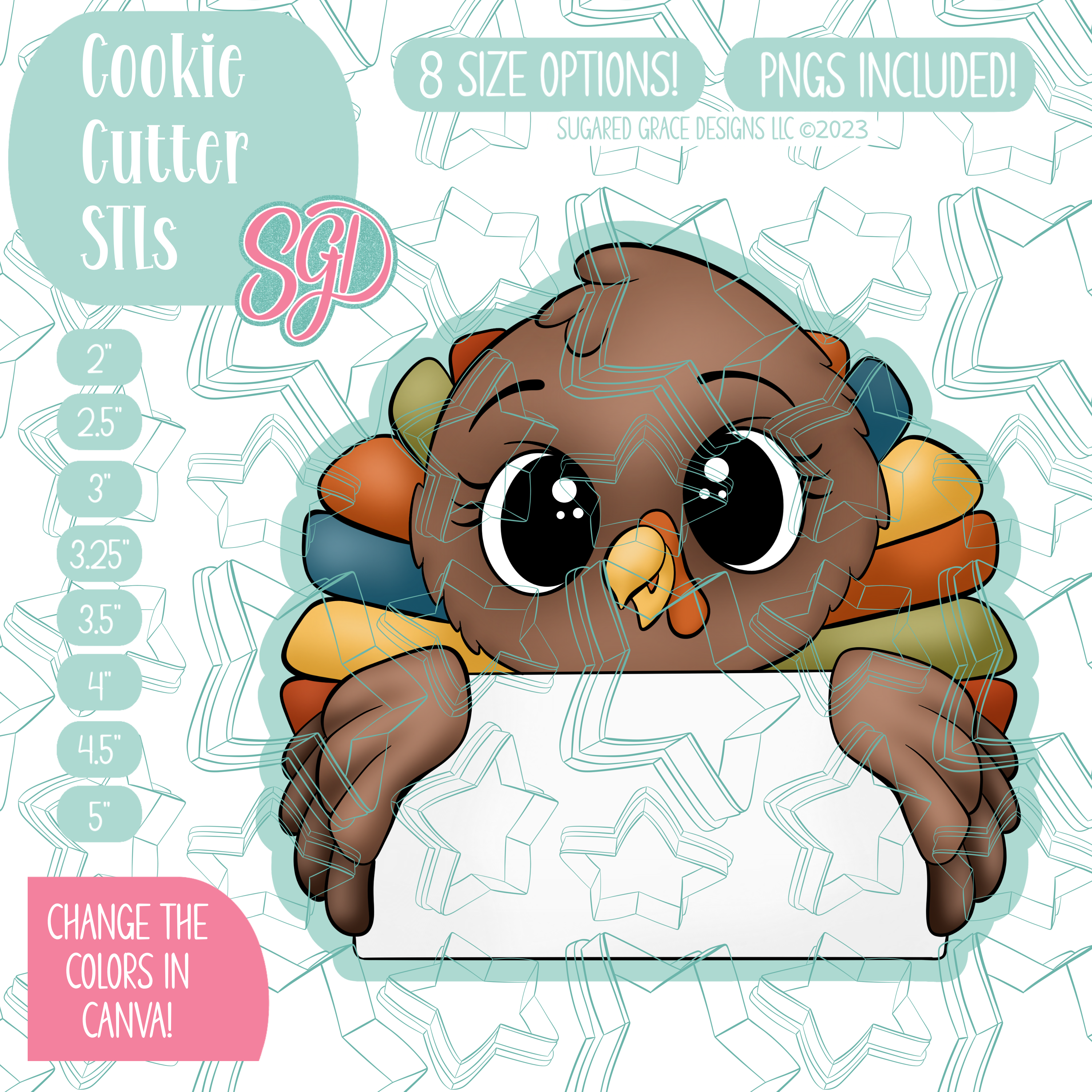 Place settings that double as keepsakes! This bright eyed turkey holds a customizable plaque you can hadn’t write with an edible marker, print with an edible ing printer or decorate with piping bag and projector. It’s perfect for Thanksgiving dinner, hostess favors, or a centerpiece on your pie platter. The plaque can have a guest’s name, a thankful note, or any little message that makes the table feel personal. Clean shapes make decorating fast and fun!